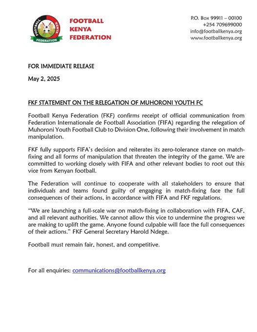 The Football Kenya Federation (FKF) announced on Friday that Muhoroni Youth has been relegated after FIFA found the second-tier Kenyan club guilty of match-fixing.