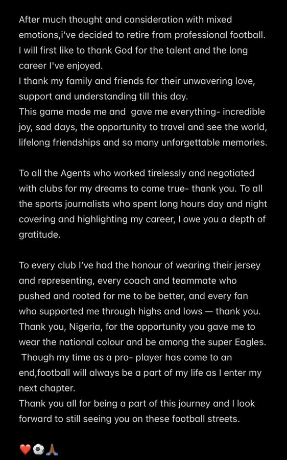 “I will first like to thank God for the talent and the long career I’ve enjoyed,” Ideye wrote. “I also thank my family and friends for their unwavering love, support and understanding till this day.”