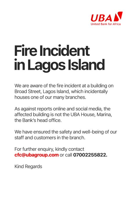 United Bank for Africa (UBA) has clarified that its head office, UBA House on Marina, was not affected by the fire outbreak reported on Tuesday, September 16, at Afriland Tower on Broad Street, Lagos Island.