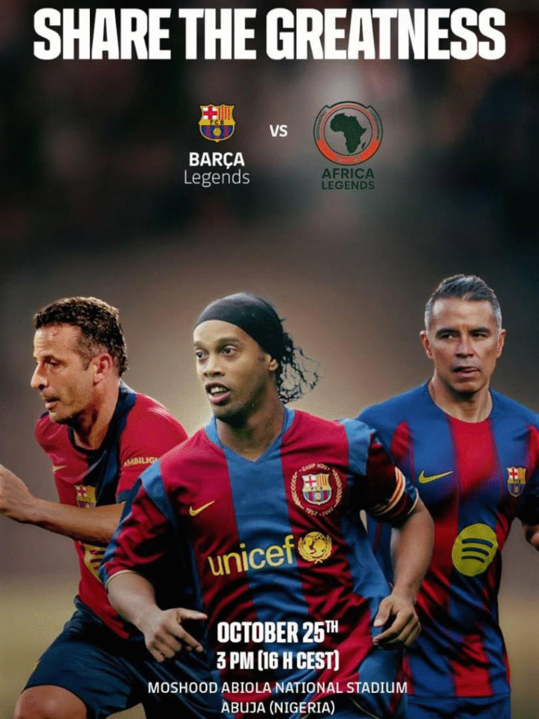 After edging Monterrey 3–2 in Mexico thanks to a David Villa hat-trick, the Barça Legends are heading to Nigeria for their second outing of the season. Albert Ferrer’s side will face a team of Africa Legends on Saturday, October 25, at the 60,000-capacity Moshood Abiola National Stadium in Abuja, with kickoff scheduled for 3 p.m. local time (4 p.m. CET).