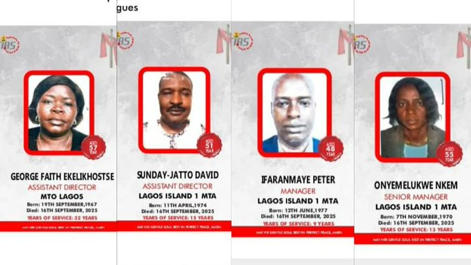 FIRS, in a statement signed by the Special Adviser on Media to its Chairman, Dare Adekanmbi, identified the deceased officials as Mrs Ekelikhostse George (Assistant Director), Mr David Sunday-Jatto (Assistant Director), Mrs Nkem Onyemelukwe (Senior Manager), and Mr Peter Ifaranmaye (Manager).