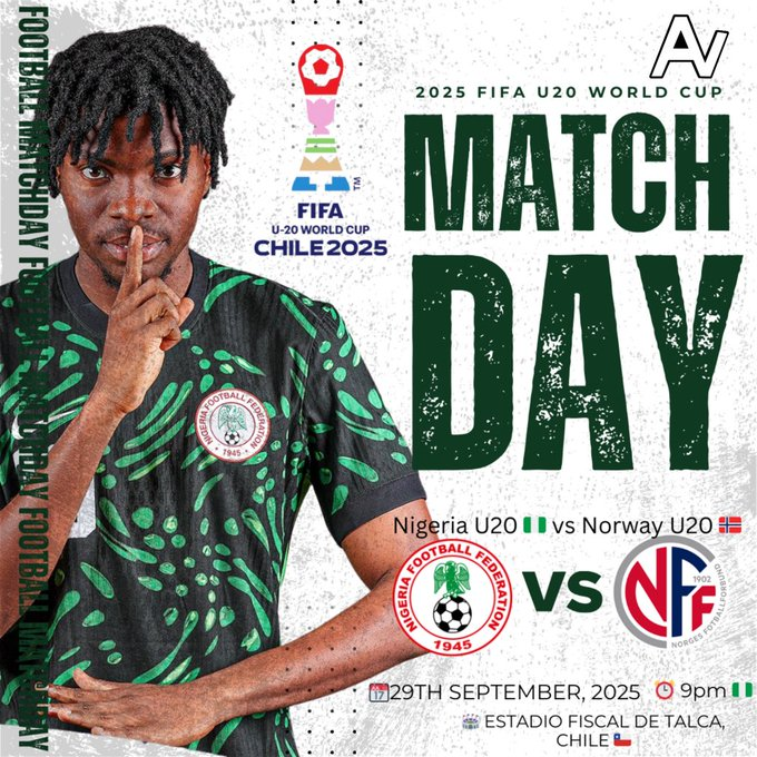 The curtain rises on the FIFA U20 World Cup as Nigeria’s Flying Eagles lock horns with Norway’s Young Vikings in a highly anticipated Group-stage opener at the Estadio Fiscal de Talca, Chile, on September 29, 2025, at 21:00 WAT.