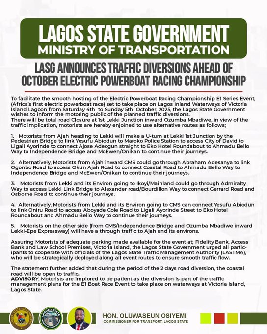 The Lagos State Ministry of Transportation has announced traffic diversions on Lagos Island ahead of the E1 Lagos GP, Africa’s first-ever electric powerboat racing event, scheduled for Saturday, October 4, and Sunday, October 5.