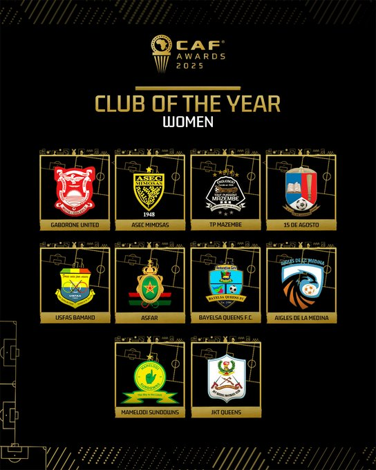 For Women’s Club of the Year, Bayelsa Queens FC represents Nigeria on a list that includes Gaborone United, ASEC Mimosas, TP Mazembe, USFAS Bamako, ASFAR, DE Agosto, Mamelodi Sundowns, Aigles De La Medina, and JKT Queens.