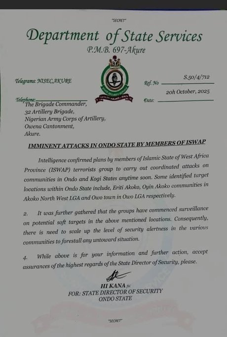 The letter, signed by one H. I. Kana on behalf of the State Director of Security and titled “Imminent Attacks in Ondo State by Members of ISWAP,” listed the targeted areas in Ondo State as Eriti-Akoko and Oyin-Akoko in Akoko North-West Local Government Area, and Owo town in Owo Local Government Area.