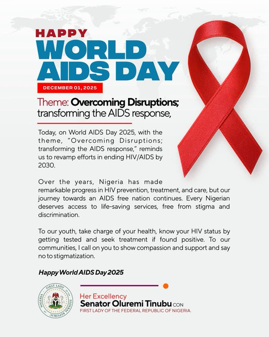 Mrs. Tinubu made the appeal on Monday via her X handle in commemoration of World AIDS Day 2025, themed “Overcoming Disruptions; Transforming the AIDS Response.” She described the annual observance as a reminder to intensify efforts in the fight against HIV/AIDS.