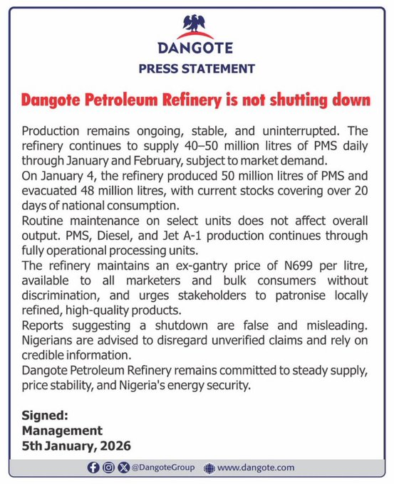 Dangote Petroleum Refinery has dismissed reports suggesting it is shutting down for maintenance, describing the claims as false and misleading.