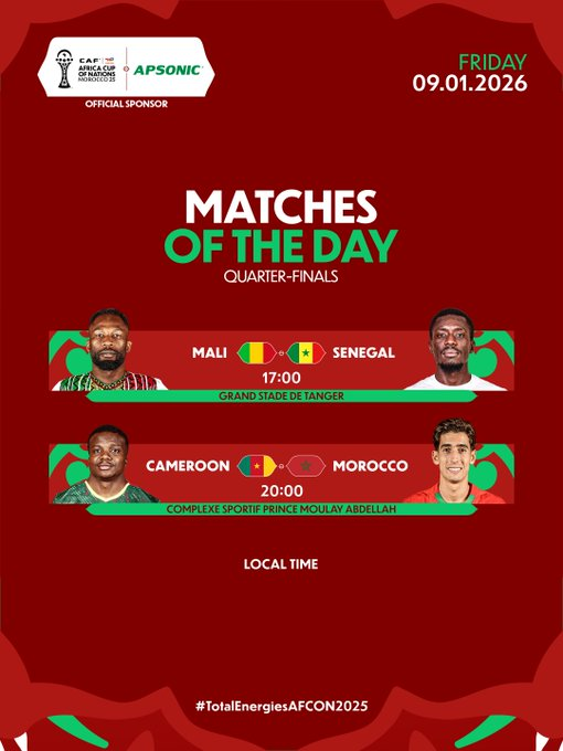 Key quarter-final fixtures include Egypt vs. defending champions Côte d’Ivoire on Saturday, Morocco vs. Cameroon on Friday, Senegal vs. Mali in an all-West African clash, and Nigeria vs. Algeria on Saturday.