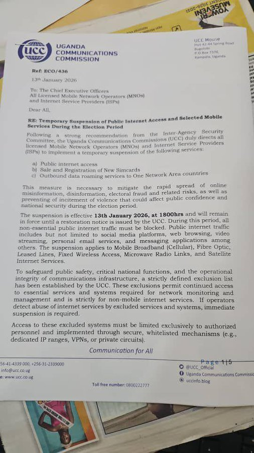 The blackout was directed on Tuesday, two days before the polls, according to a letter from the Uganda Communications Commission (UCC) to internet service providers. The directive, which was verified by government officials, said the measure was aimed at curbing the spread of online misinformation and disinformation, preventing electoral fraud, and stopping incitement to violence that could undermine public confidence and national security during the election period.