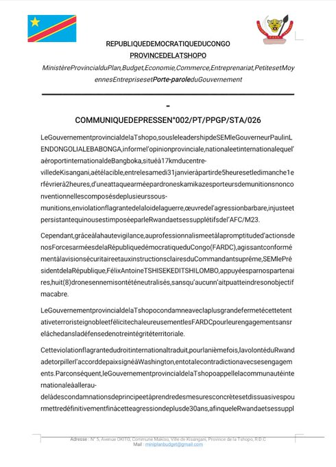 According to a statement by the Tshopo provincial authorities, the attacks occurred between Saturday and Sunday. “Eight enemy drones were neutralised before reaching their target,” the statement said. No casualties have been reported.