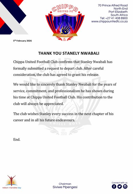 “Chippa United Football Club confirms that Stanley Nwabali has formally submitted a request to depart the club. After careful consideration, the club has agreed to grant his release,” the statement said.
