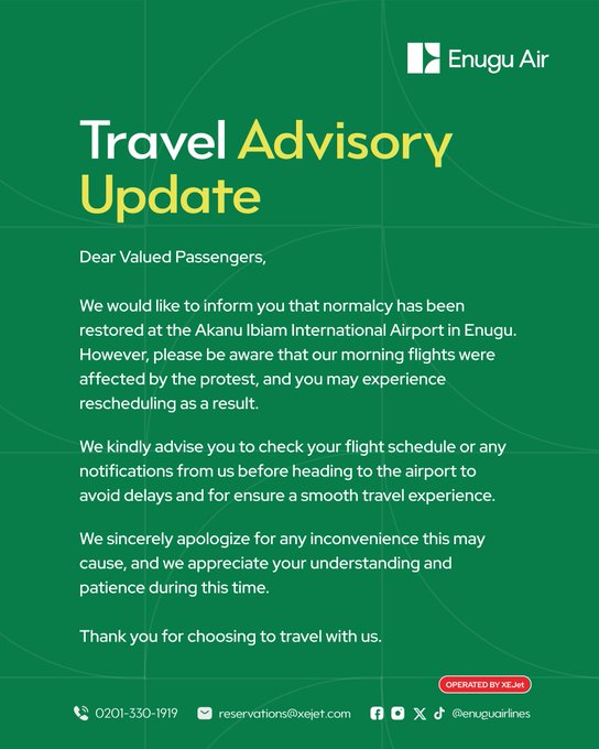 However, Enugu Air later confirmed that normal operations had been restored. In an update posted on its official X account on Friday, the airline said flights had resumed, though some services were affected by the protest.