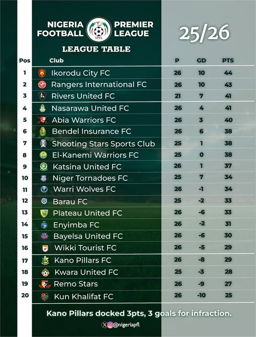 Rivers United, now third on 41 points, have five games in hand after exiting the CAF Champions League, keeping them firmly in the title conversation despite recent setbacks.