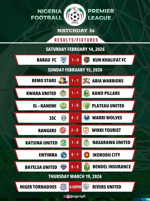 Elsewhere, Katsina United edged Nasarawa United 1-0 thanks to a late Boubacar Massaly strike. Kwara United were held to a 1-1 draw by Kano Pillars after surrendering an early advantage.