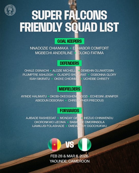 Super Falcons head coach Justine Madugu has unveiled a 25-player squad for Nigeria’s upcoming international friendly matches against Cameroon as preparations intensify for the 2026 Women’s Africa Cup of Nations (WAFCON).