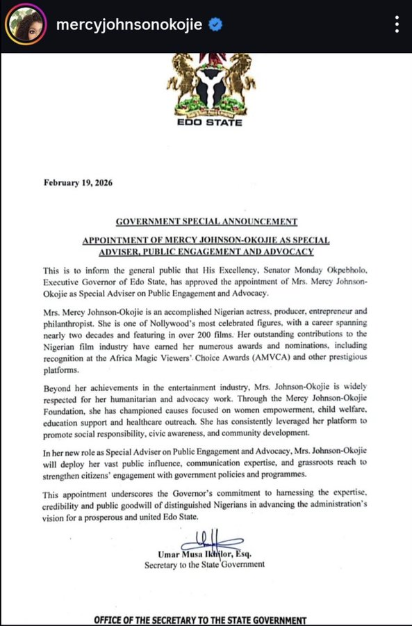 Nollywood actress and philanthropist Mercy Johnson-Okojie has been appointed Special Adviser on Public Engagement and Advocacy by Edo State Governor, Monday Okpebholo.