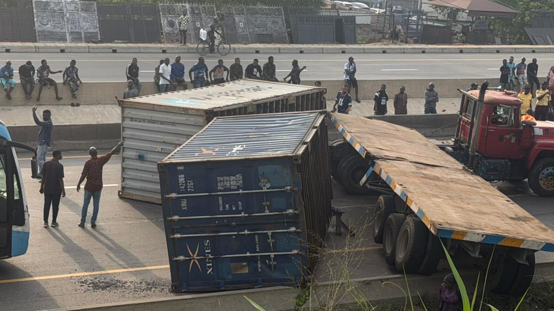 A truck carrying two 20-foot containers overturned on the Otedola bridge section of the Lagos-Ibadan expressway on Wednesday morning, causing traffic disruption and bedlam.
