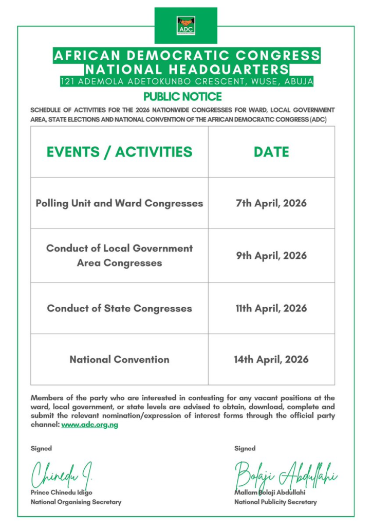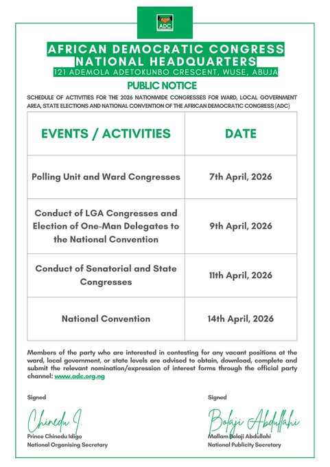 NIGERIA: African Democratic Congress Fixes April 14, 2026 For National Convention