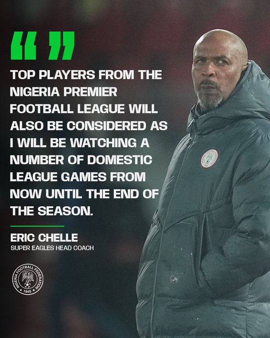 Super Eagles head coach Éric Chelle has opened the door to players in the Nigeria Premier Football League (NPFL) and uncapped foreign-based Nigerians as part of preparations for the 2026 Unity Cup in London.