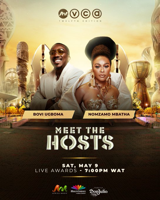 The Africa Magic Viewers’ Choice Awards has announced a new hosting lineup for its 12th edition, with Nigerian comedian Bovi Ugboma and South African actress Nomzamo Mbatha set to co-host the ceremony scheduled for May 9, 2026, at Eko Hotel and Suites in Lagos.