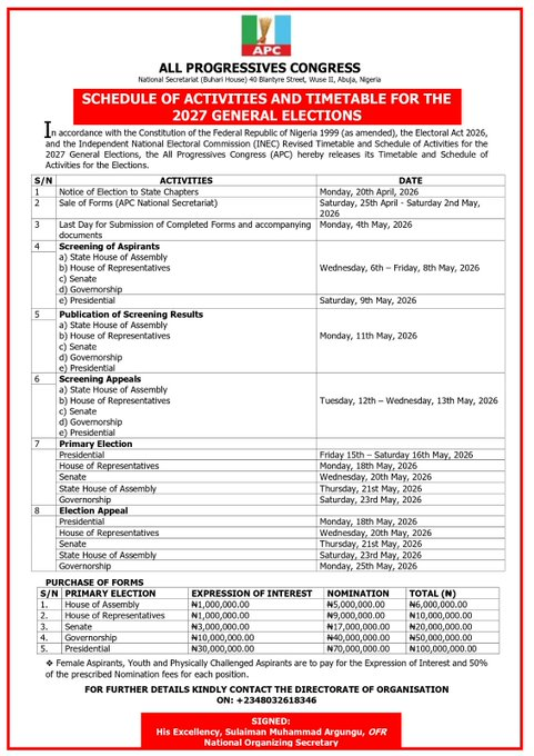 The All Progressives Congress (APC) has announced May 16 and May 23, 2026, as the dates for its presidential and governorship primary elections ahead of the 2027 general elections.